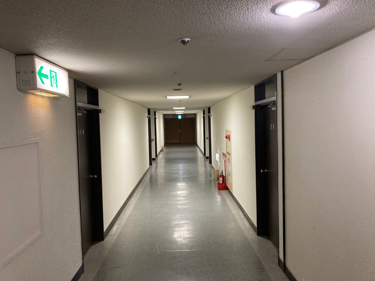 PM12:00に館内のほとんどの電気を消します。電気がついているのは、大浴場前、エレベーター前、客室の廊下くらいです。滅多にありませんが、深夜にチェックインされるお客様もいるので、その場合は、まだ電気は点けておきます。